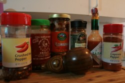 crushed red pepper, Vietnamese chili garlic sauce, Russian adjika, chili powder, Tabasco sauce, cayenne pepper, Tōgarashi (middle)